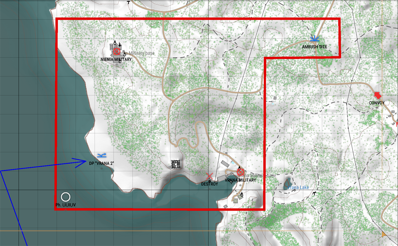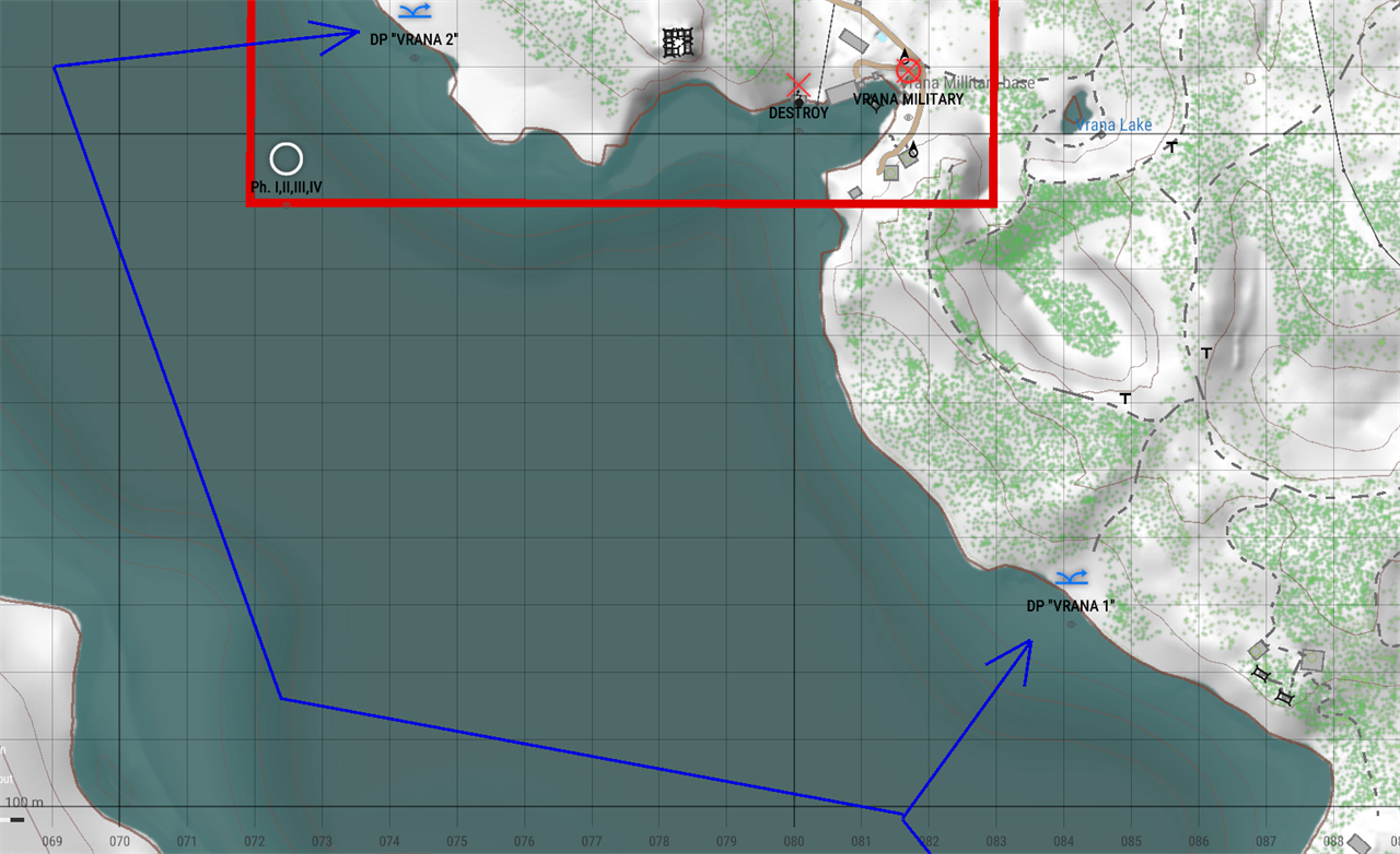 Phase I – Infiltration: Conduct covert shore landing near Vrana Military Outpost. Maintain stealth and avoid detection.